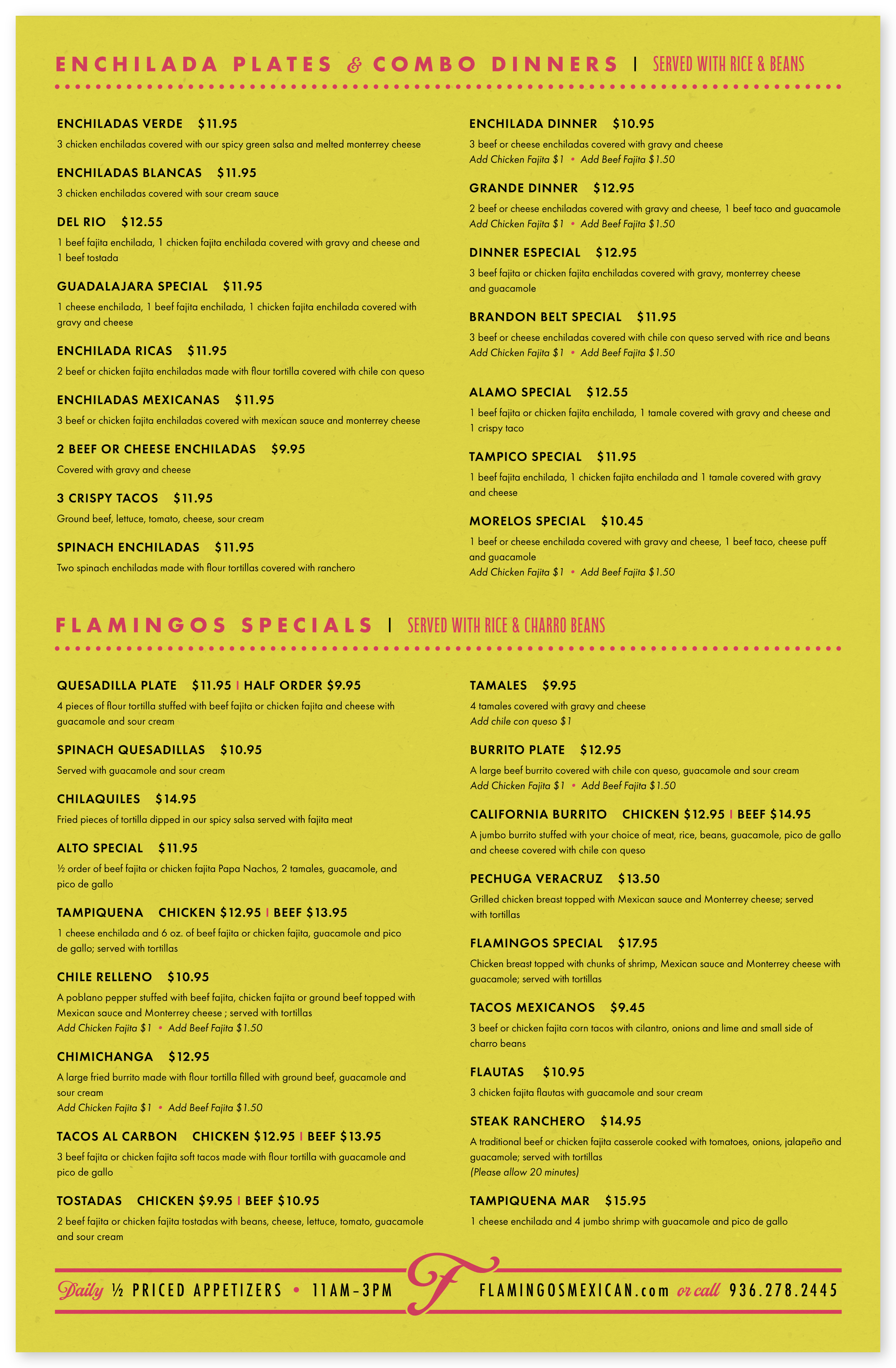 Flamingos Mexican Restaurant is a laid-back, classic Tex-Mex spot that serves up bold flavors for breakfast, lunch, and dinner, with daily specials and live music on the weekends. Rooted in comfort and community, the restaurant offers an inviting atmosphere where locals can relax, enjoy good food, and listen to great music. With a name as playful as "Flamingos," the owners wanted their brand to reflect the fun, casual energy of the space—while still feeling polished and intentional.